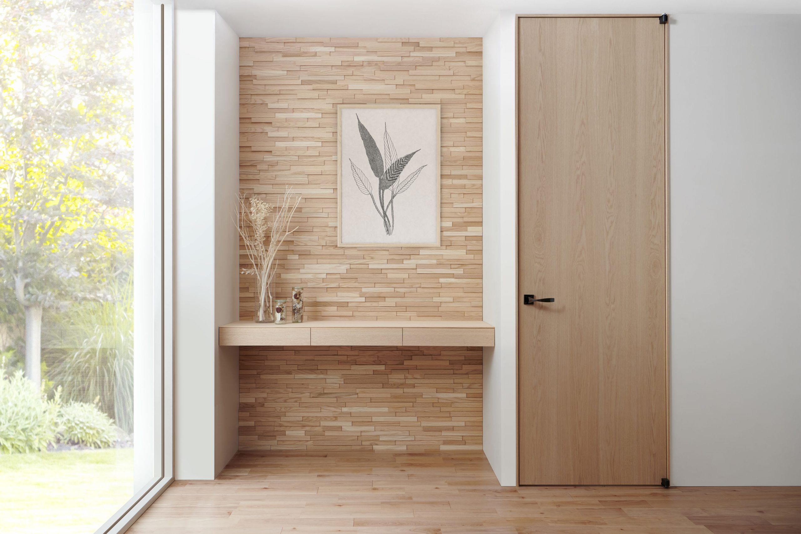 木材の有効活用から環境問題へ。家具から出る端材を使った商品開発により生まれたMOSAIC2 は、素材の美しさを最大限表現する家具メーカーならではのこだわりが込められています。家具との調和を大切にした材種ラインナップとカラーバリエーション。無垢のウッドパネルの” 木心地” を感じる表情とランダムに構成されたパターンが鮮やかな空間づくりを実現します。