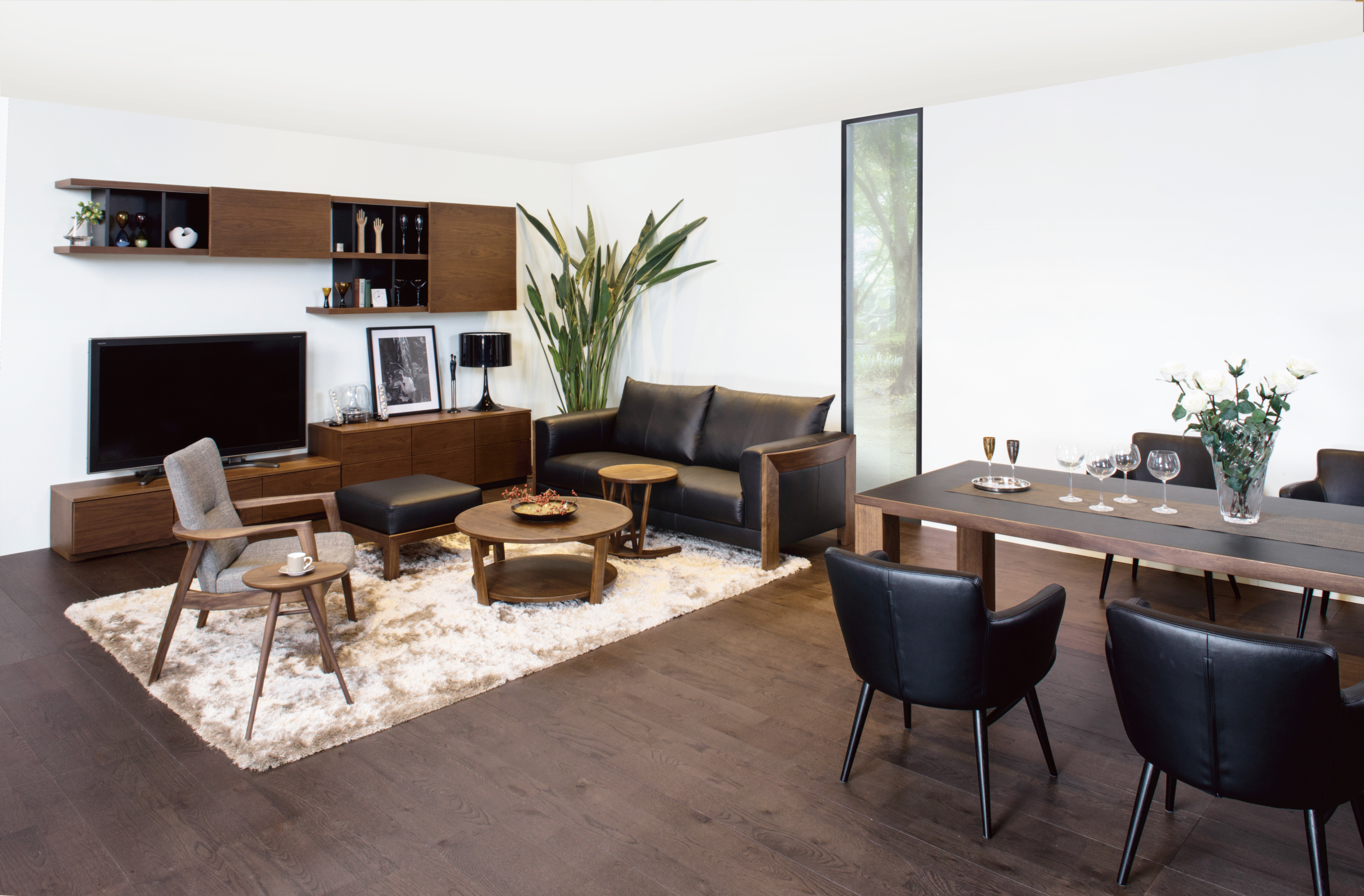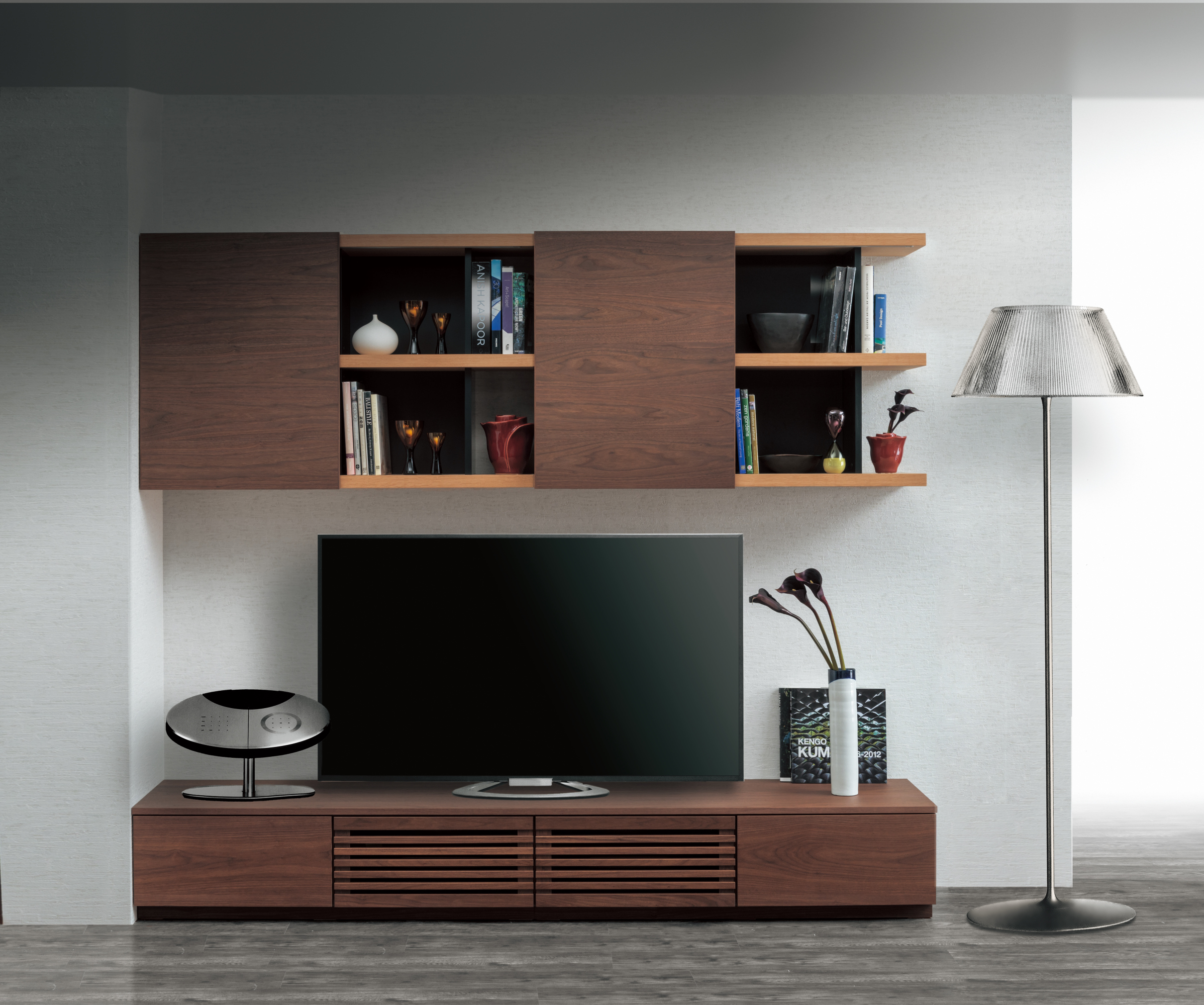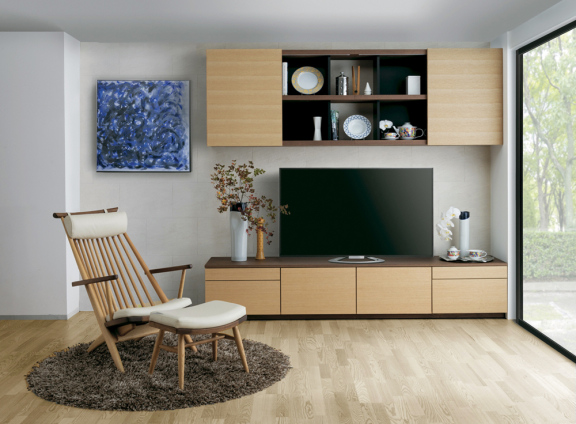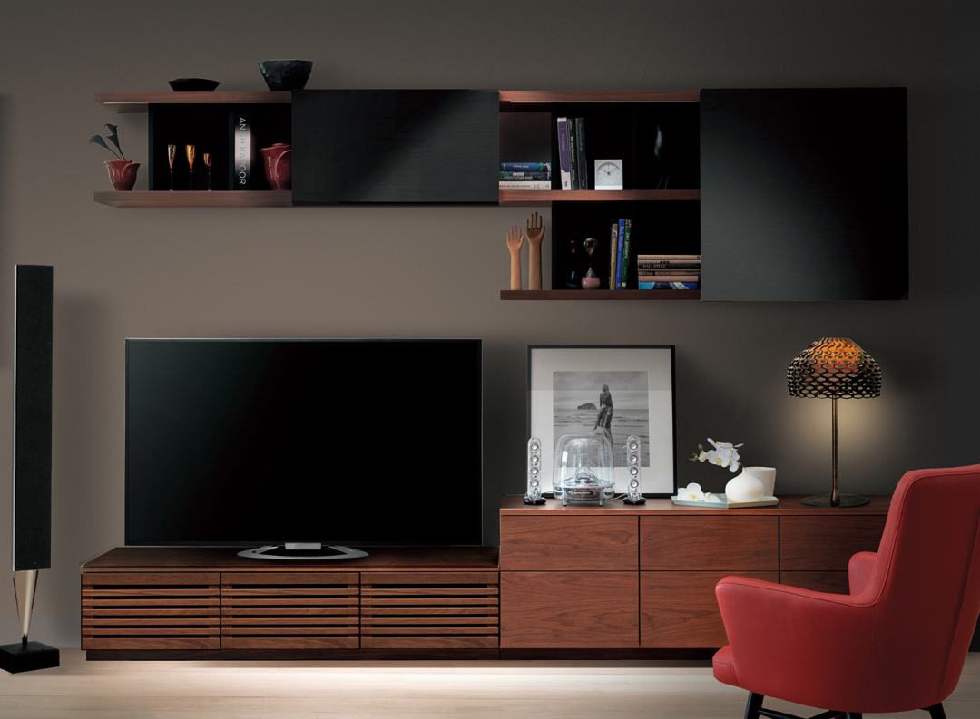 シンプルな構成の中に、リモコンの赤外線を通すアクリル突板タイプや、ガラスタイプ、ルーバータイプなど、機能的で多彩な表情を持つフラップ扉や、引き出しなど、TVボードとしての使い勝手にも配慮したKAZARU TV board。高さ2タイプ(H350/450mm)、幅はW500とW600のモジュールと機能を組み合わせた7タイプ(W1200/1500/1600/1700/1800/2000/2400mm)のサイズバリエーションで、TV周辺を魅力的に演出します。