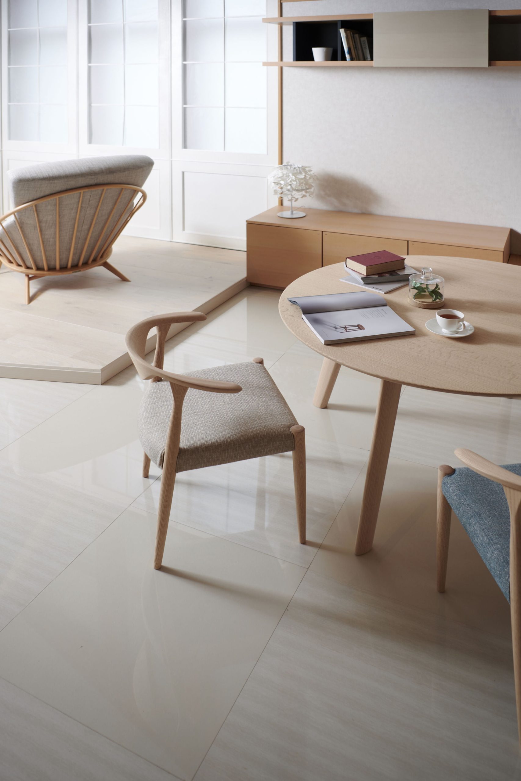 あわただしい朝からくつろぎの時間まで。「リット」は毎日の使用に耐える機能性と、インテリアエレメントとしての木製家具の魅力を追求しました。 テーブルは縁を削り込むことでチェアとの収まりを最適にしています。丸みを帯びた形状はやさしくモダンなダイニングシーンを演出します。