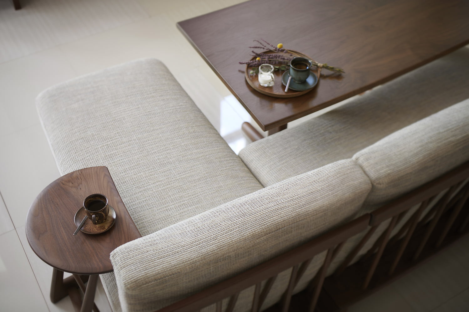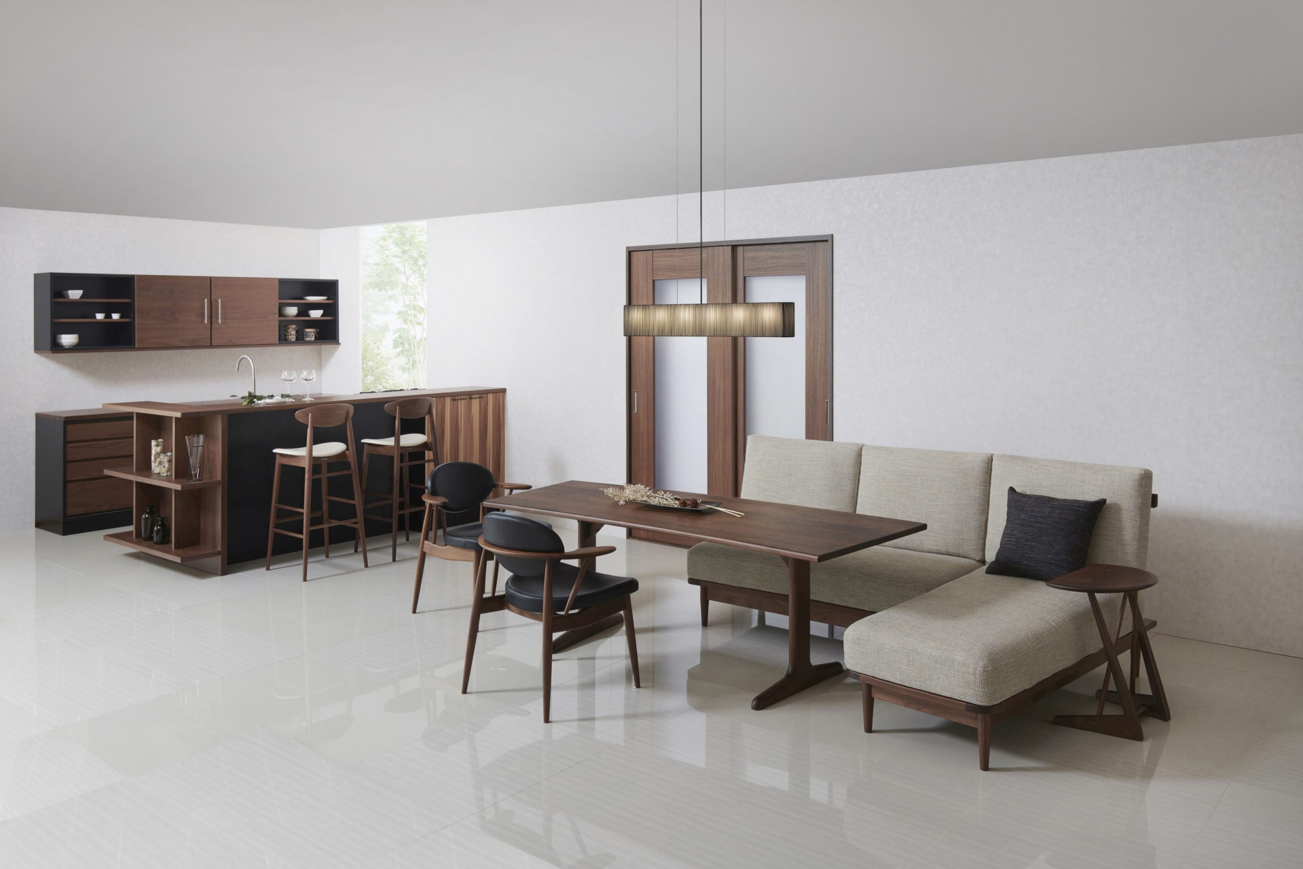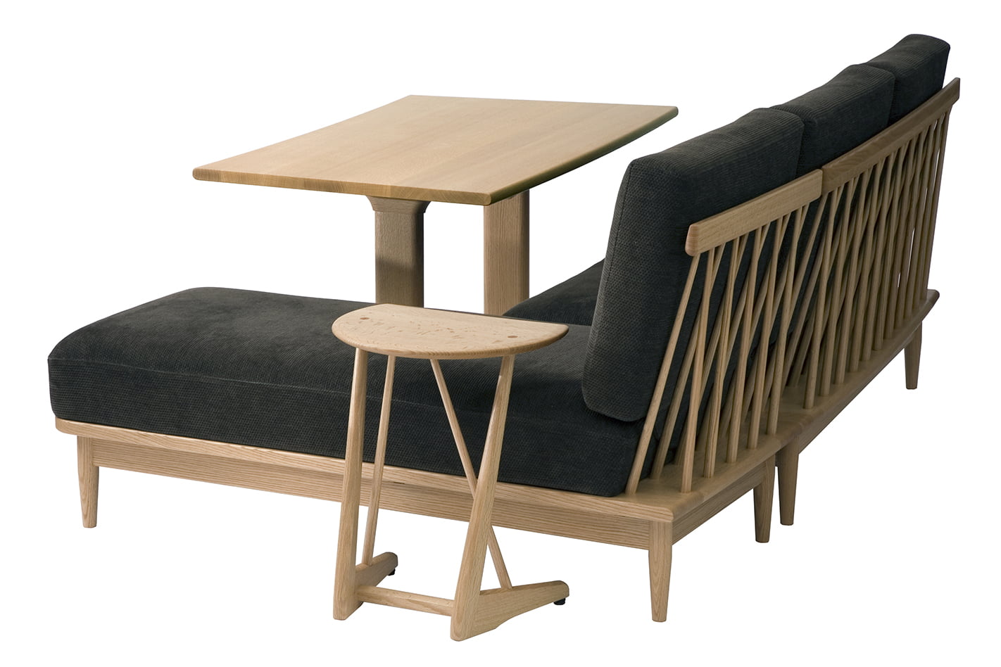 SENSU(センス)は、新しい暮らし方の提案をコンセプトに、『寛ぐ』・『食事をする』という2つの機能を満たしながら座り心地、デザイン性ともに高感度の仕上がりを追求しました。「子供たちの巣立ちによる生活スタイルの変化」や、「必要最小限の家具でゆったりとした新生活」を提案イメージとしています。脇息はアームレスト兼サイドテーブルとして使い勝手の良い高さ設定とし、移動に便利な取っ手が彫り込まれています。