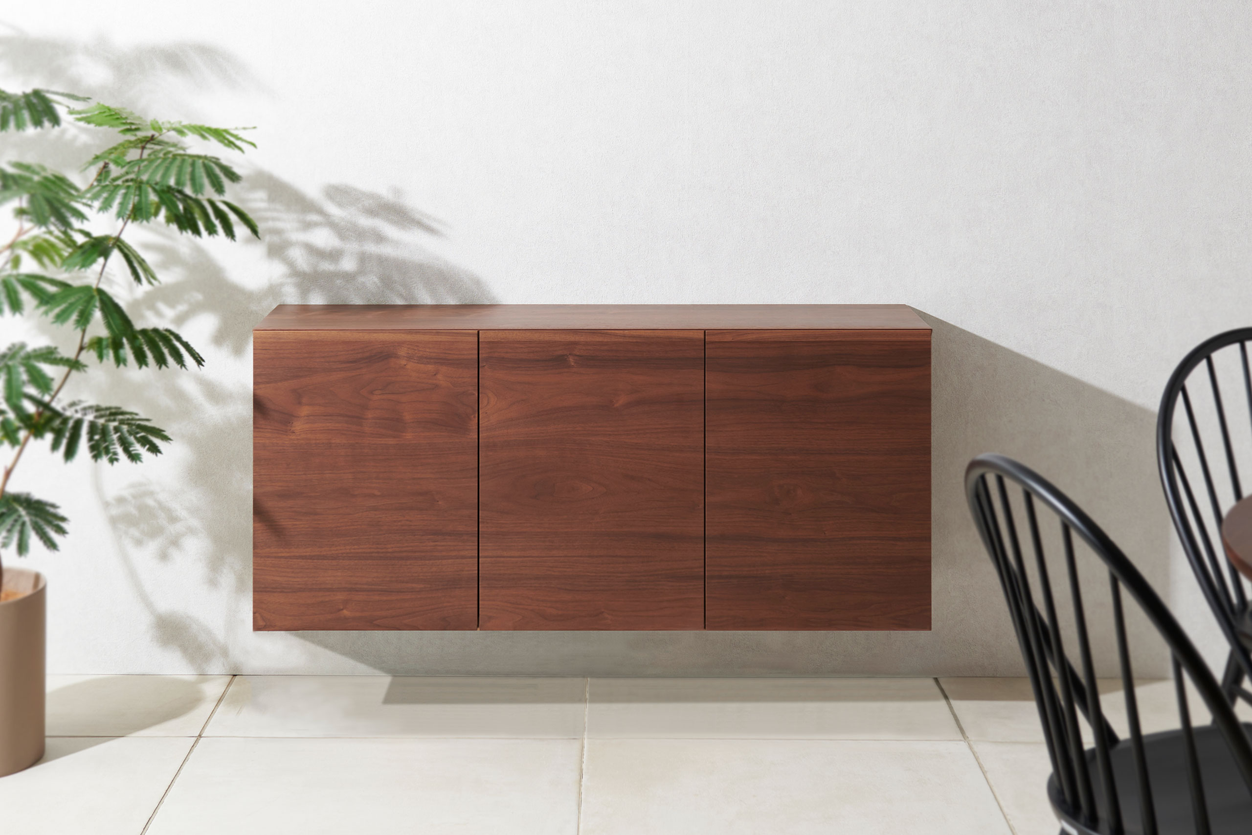 フロートタイプのサイドボード。プッシュオープン扉ですっきりとしたデザインです。オーク扉は真っ直ぐ流れるような整然とした印象の柾目タイプ(通常タイプ)と、ランダムに現れる豊かな木目が魅力のオーク板目タイプよりお選びいただけます。