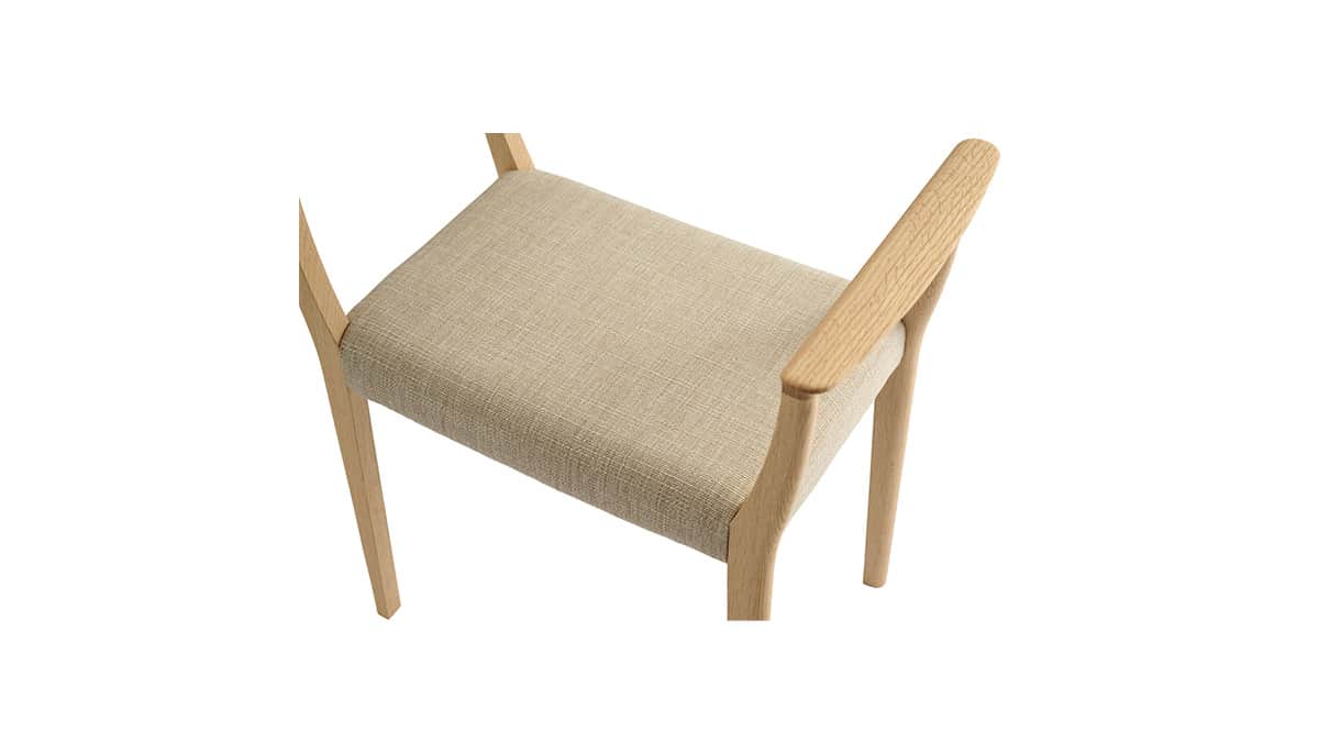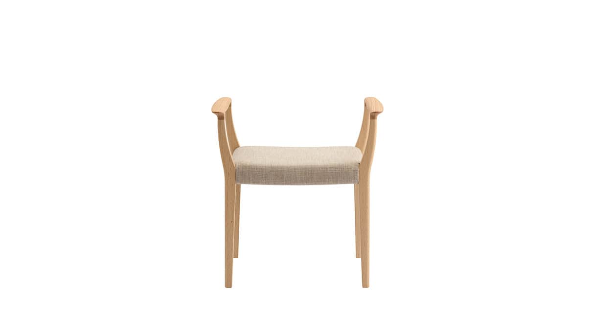玄関に置いて靴の脱着から立ち上がりをサポートするアームスツール。直に手の触れる肘部から脚部にかけて入念な手作業による仕上げを施し、静謐な佇まいの中で木材がもたらす質感の心地良さを高めています。