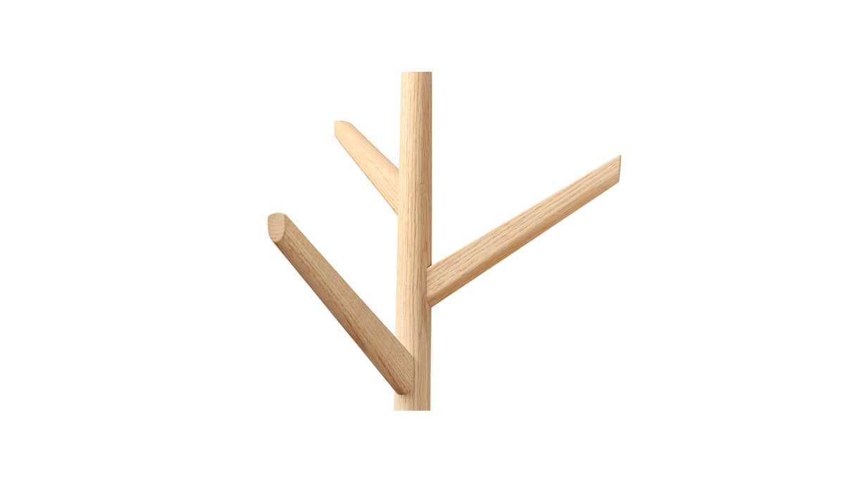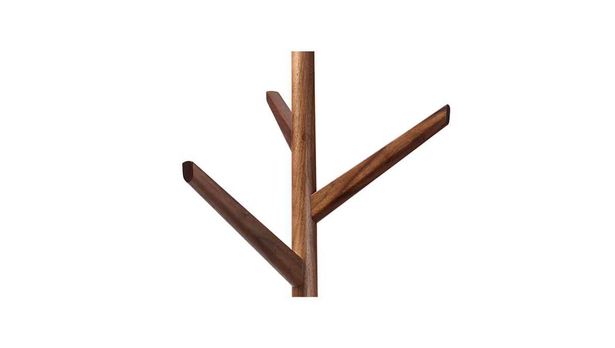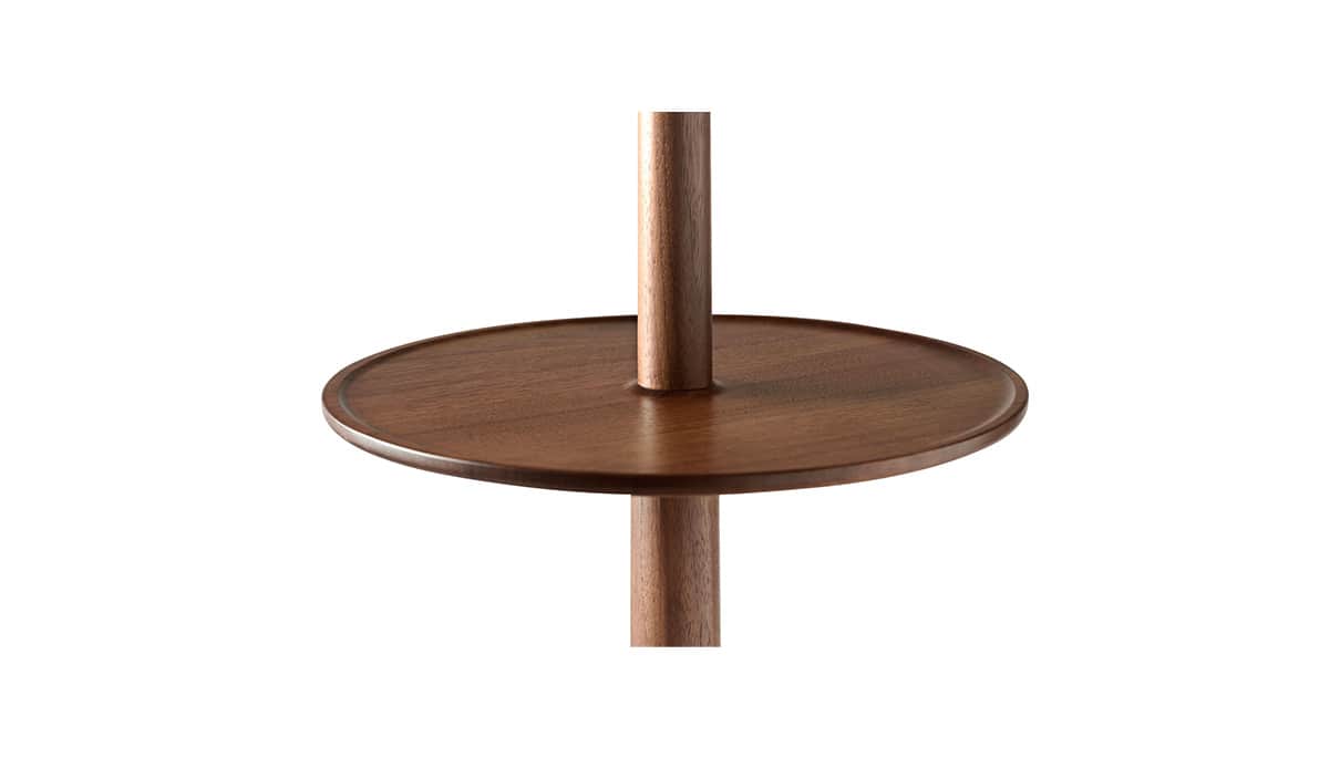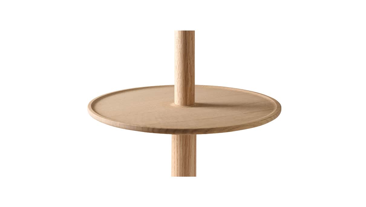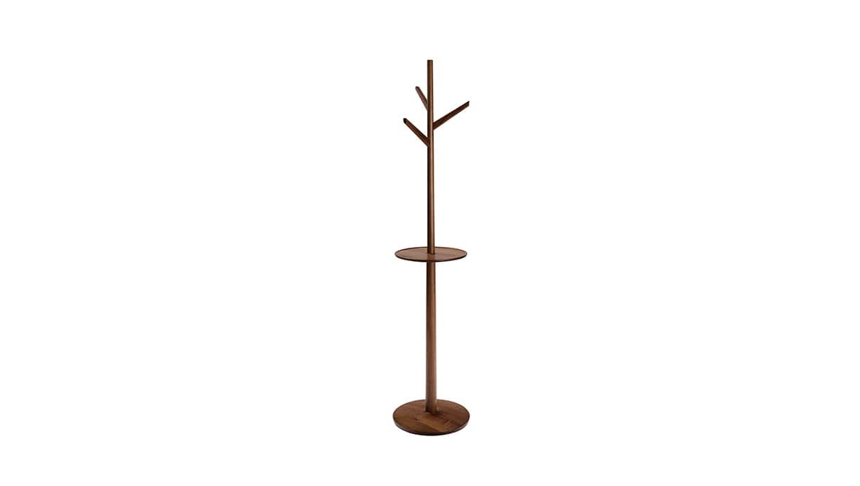 テーブル付のコートスタンド。帰宅して脱いだコートの他に郵便受けにあったハガキ、ポケットの中の鍵などを置くスペースをプラスしました。インテリアに取り入れやすい一本脚ベースの形を細部に至るまで丁寧に仕上げ、シンプルでありながら上質な木工製品としています。