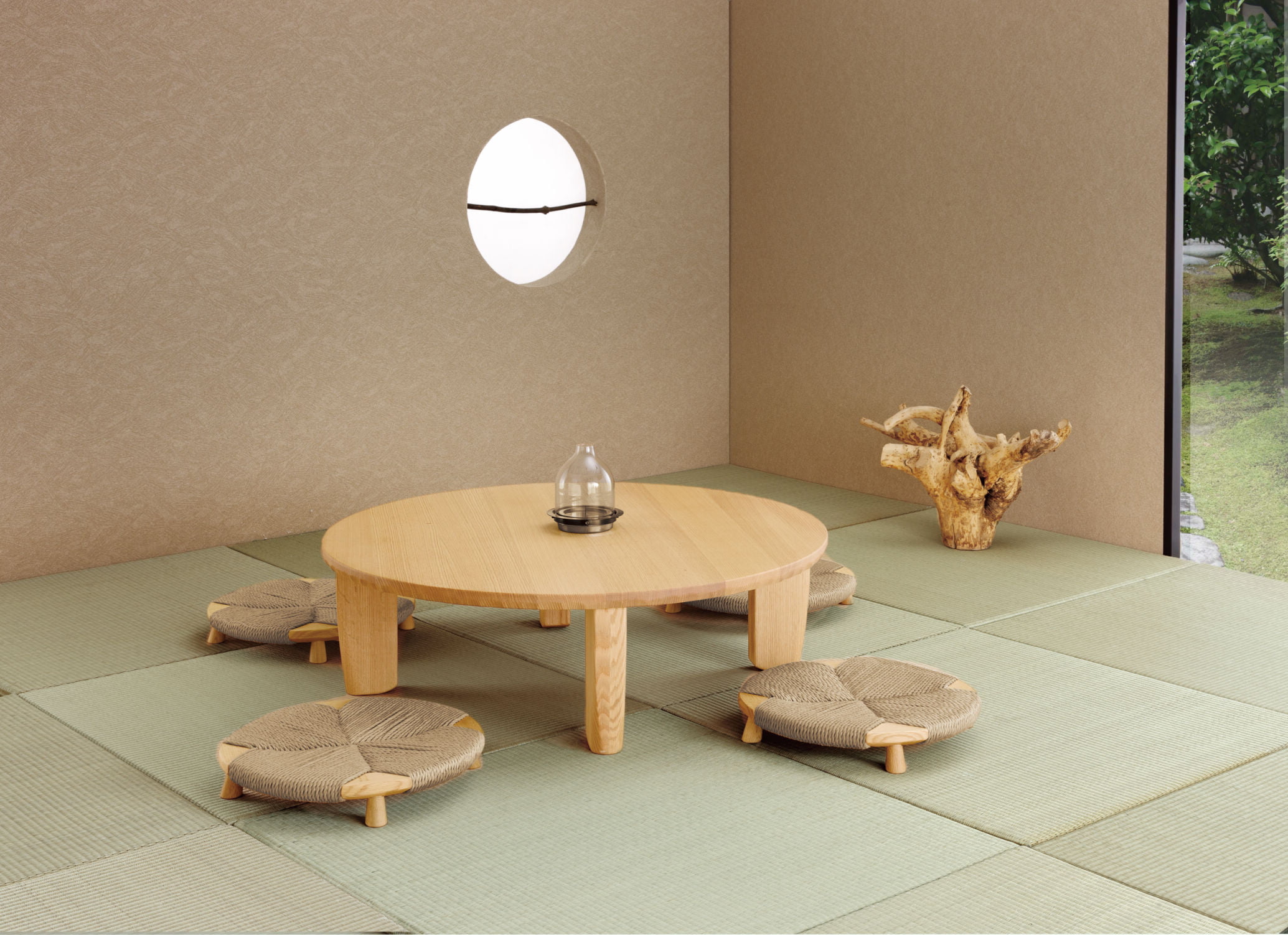 格子から透ける景色や、人々の織り成す情景を記憶しているかのような佇まい。THE ZEN(座膳)は、伝統的な要素を現代の生活空間へと調和させました。オーク無垢材で仕上げられた重厚感のある丸型の座卓。天板側面はクラフト面とナチュラル面からお選びいただけます。