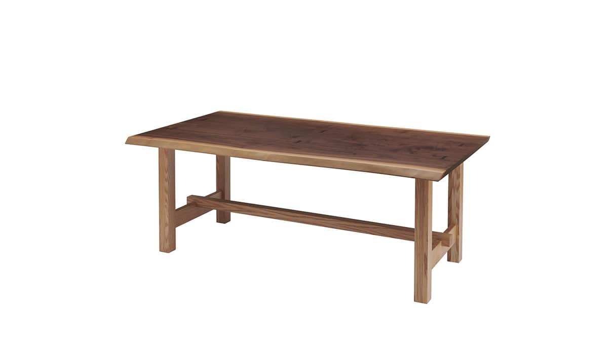 40㎜厚の上質なウォールナット材が魅力のダイニングテーブル。素材感を最大限に生かすシンプルな形状とウォー ルナットが持つ美しさが際立つ耳付き面。木が本来持つ魅力と確かな価値を感じることができます。
