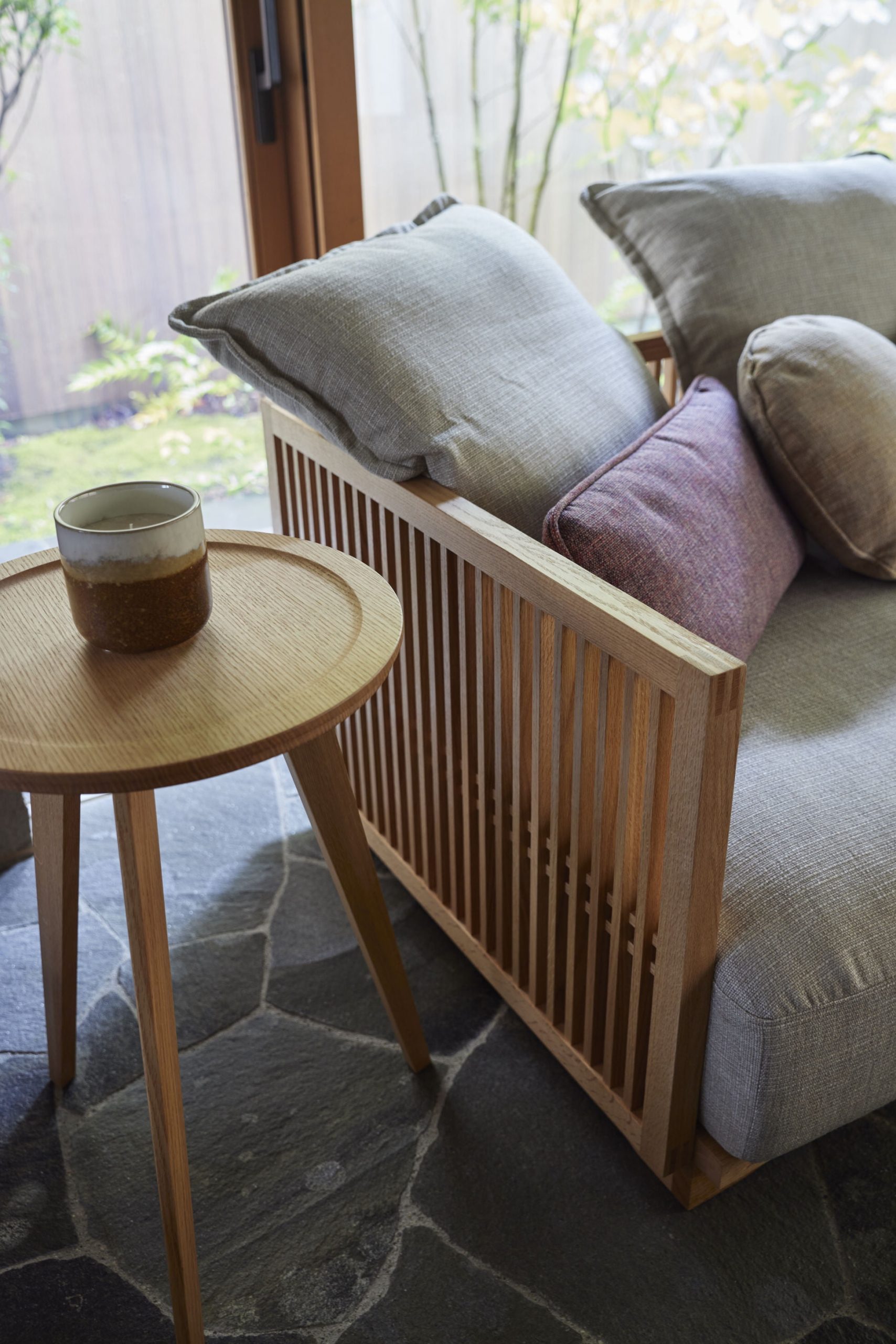 正確な設計と加工技術が必要とされる連子格子( れんじこうし) の木フレームと、自由な姿勢に応じる組み合わせ自在のルーズ・クッション。飛騨高山の伝統文化と匠をソファに結実させた、高山ウッドワークスブランド25 周年記念モデルです。