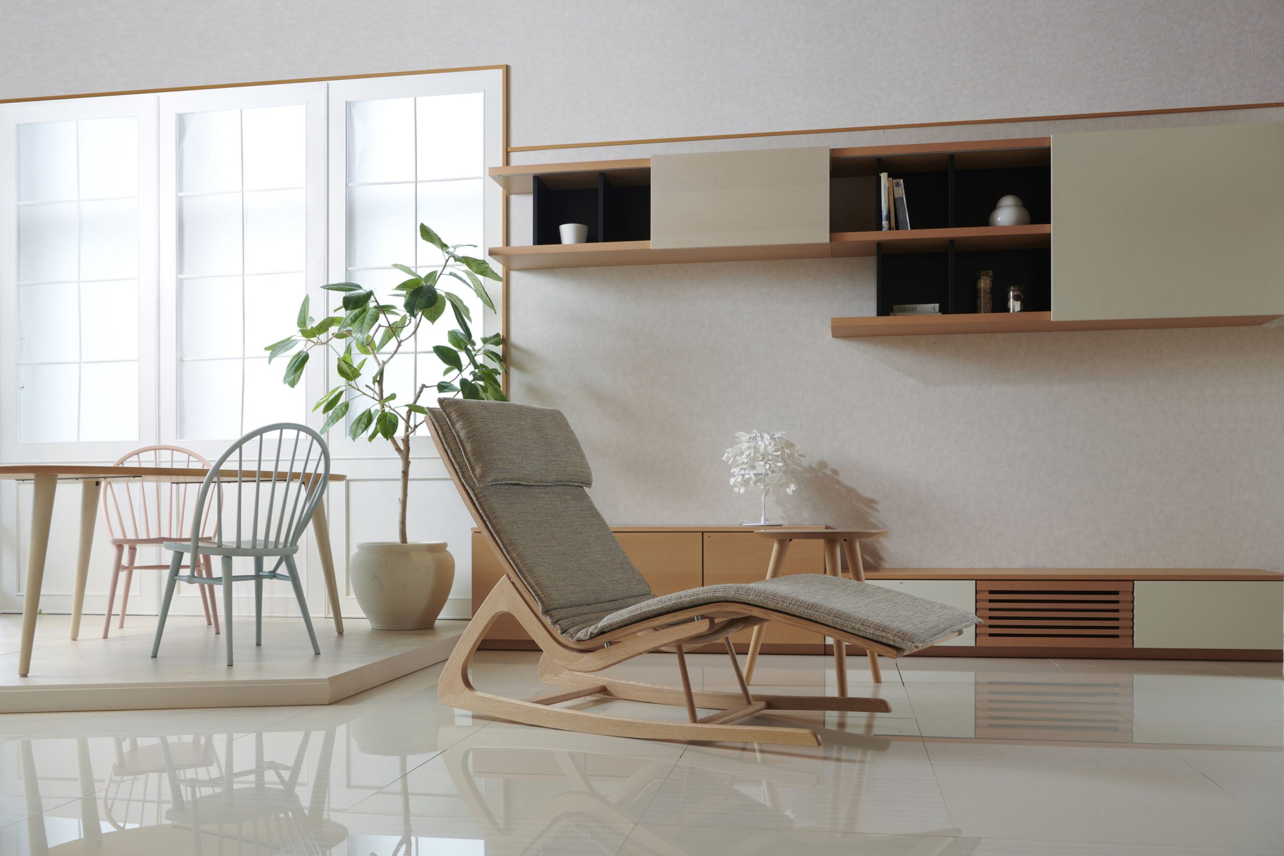 足を伸ばしてゆったりとくつろげるシェーズロング(長椅子)タイプのイージーチェア。うたた寝してしまいそうな心地良い揺れで贅沢なひと時をお過ごしください。