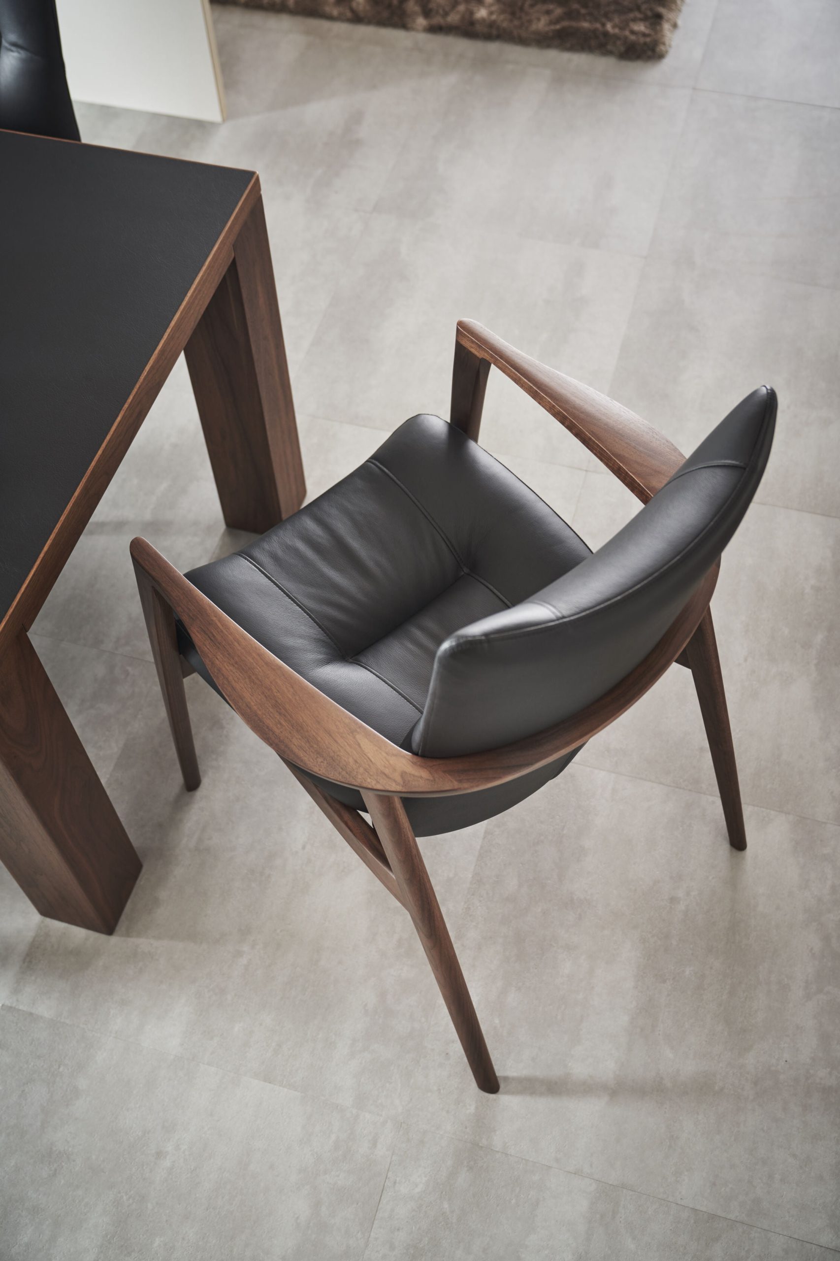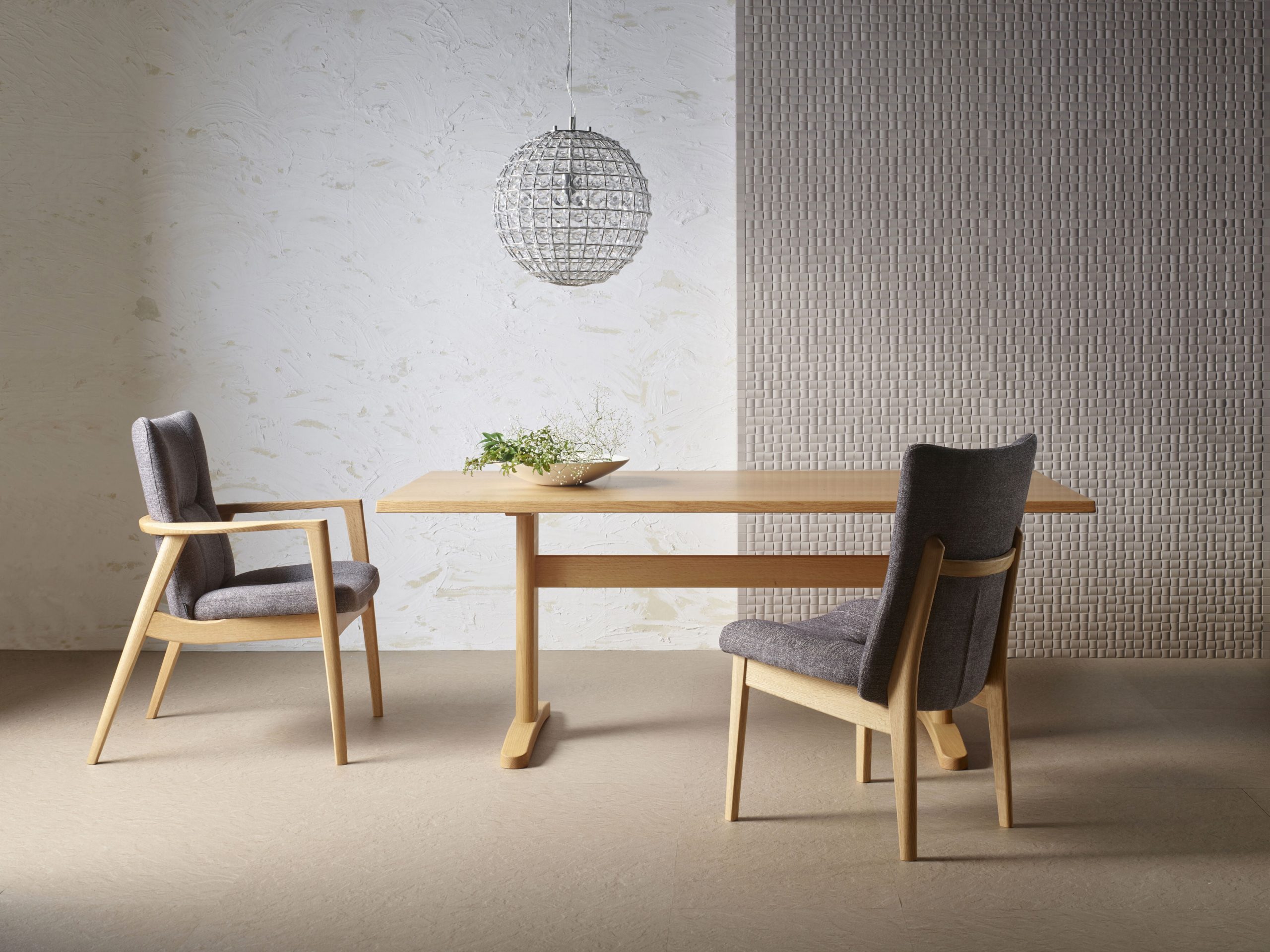 ゆったりと寛ぎながら食事と会話を楽しむダイニングチェア。肩まで支えるクッションと程よい弾力の座面にこだわった一脚です。木の椅子づくりの技術を活かし、丁寧に仕立て上げた座り心地は格別です。